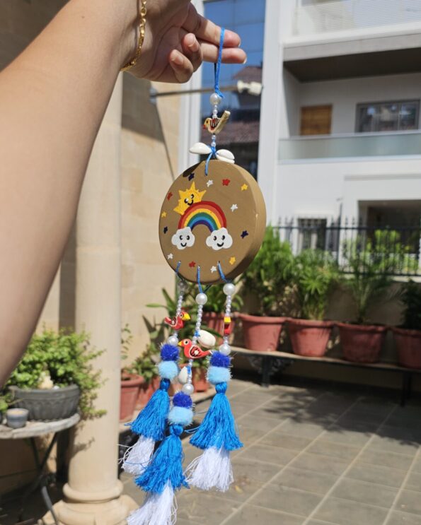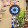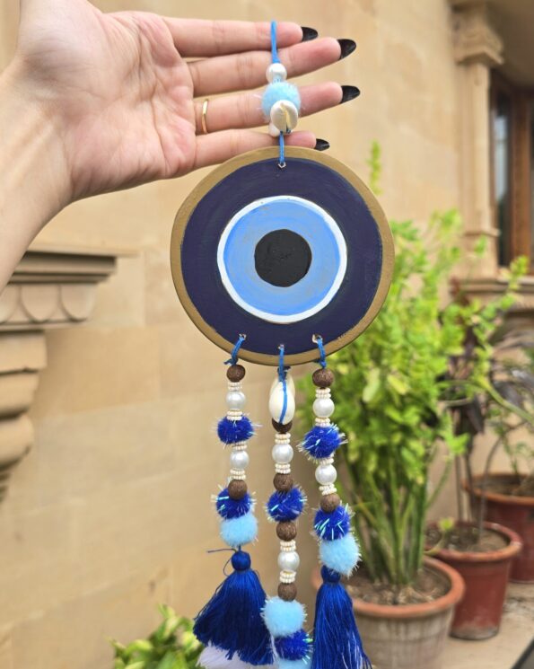 Designed to be safe for babies, this hanging is ideal for use on a baby cradle, baby cot, nursery, or at the main entrance of the house. The blue evil eye design, along with natural beads, shells, soft pom-poms, and tassels, helps create a protective shield while adding a calming and decorative touch.